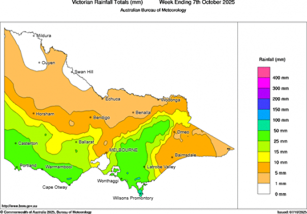 - The Bureau of Meteorology’s outlook shows a slightly above average chance (55-70%) of exceeding the median rainfall for October to December across most of Victoria’s western and central regions, and part of the north-east. This chance is lower (45-55%) across most of the state’s east and part of the south-west.