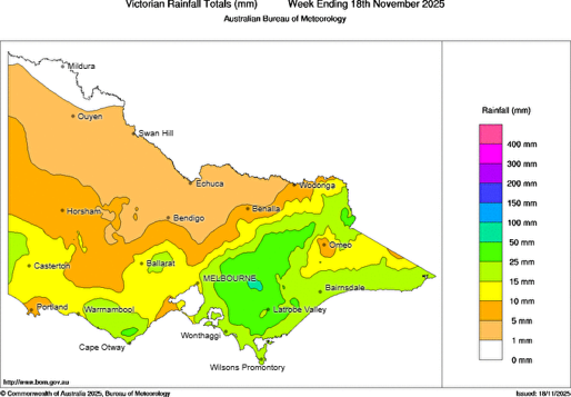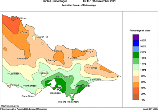 • The Bureau of Meteorology’s outlook shows that December 2025 to February 2026 rainfall has an average likelihood of exceeding the median (45-55% chance) across the south-west and west of Victoria. Most of the rest of the state has a slightly higher chance of exceeding median rainfall (55-60%).
