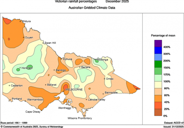 - The Bureau of Meteorology’s outlook shows that February to April 2026 rainfall has an average likelihood of exceeding the median (45-55% chance) for most of Victoria. There is a slightly lower likelihood (35-45% chance) for the central north and the southwest of the state.