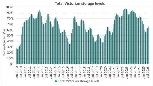- Total Victorian monthly storage levels - end January 2010 to end September 2025