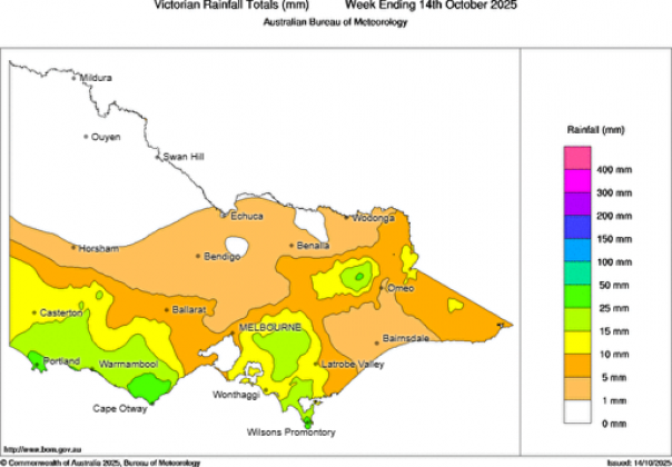 - Map of rainfall received in the week ending 14 October 2025