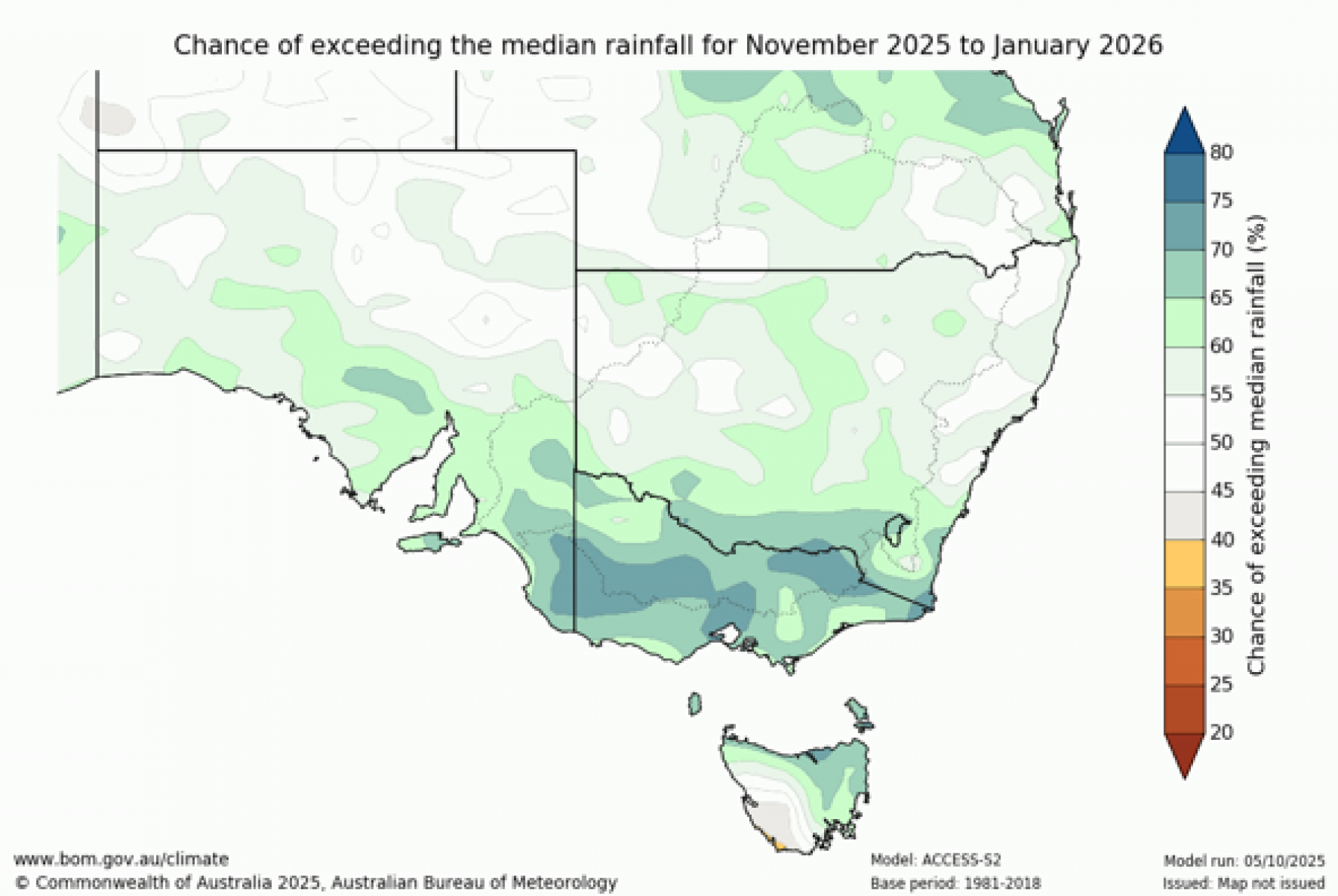 - There is a high likelihood of exceeding the median maximum temperatures (>80% chance) for a majority of Victoria in the November to January period, with slightly lower chance across part of East Gippsland (75-80%).