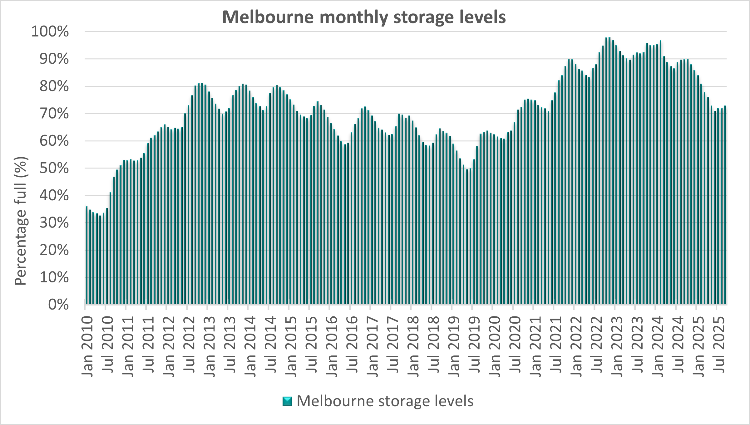 - Melbourne monthly storage levels - end January 2010 to end September 2025