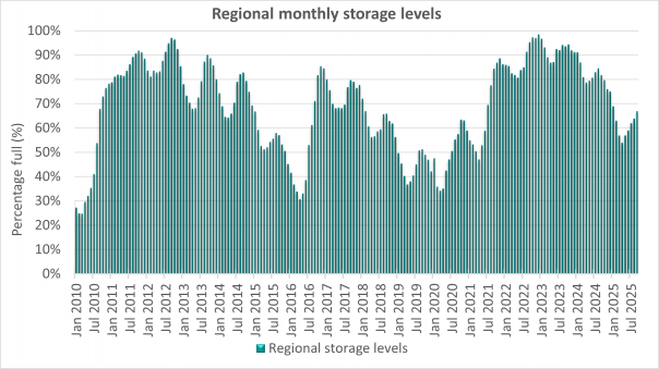 - Regional monthly storage levels - end January 2010 to end September 2025
