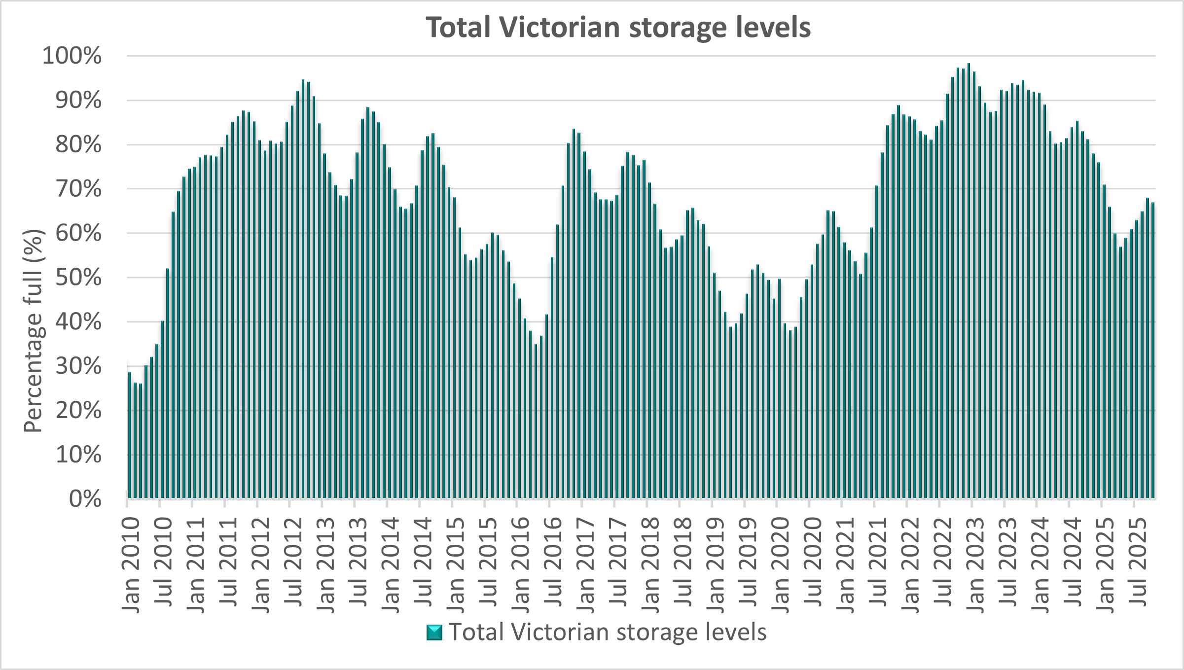 As at 11 November 2025, total combined storage levels for major Melbourne, regional and statewide storage networks were as follows: